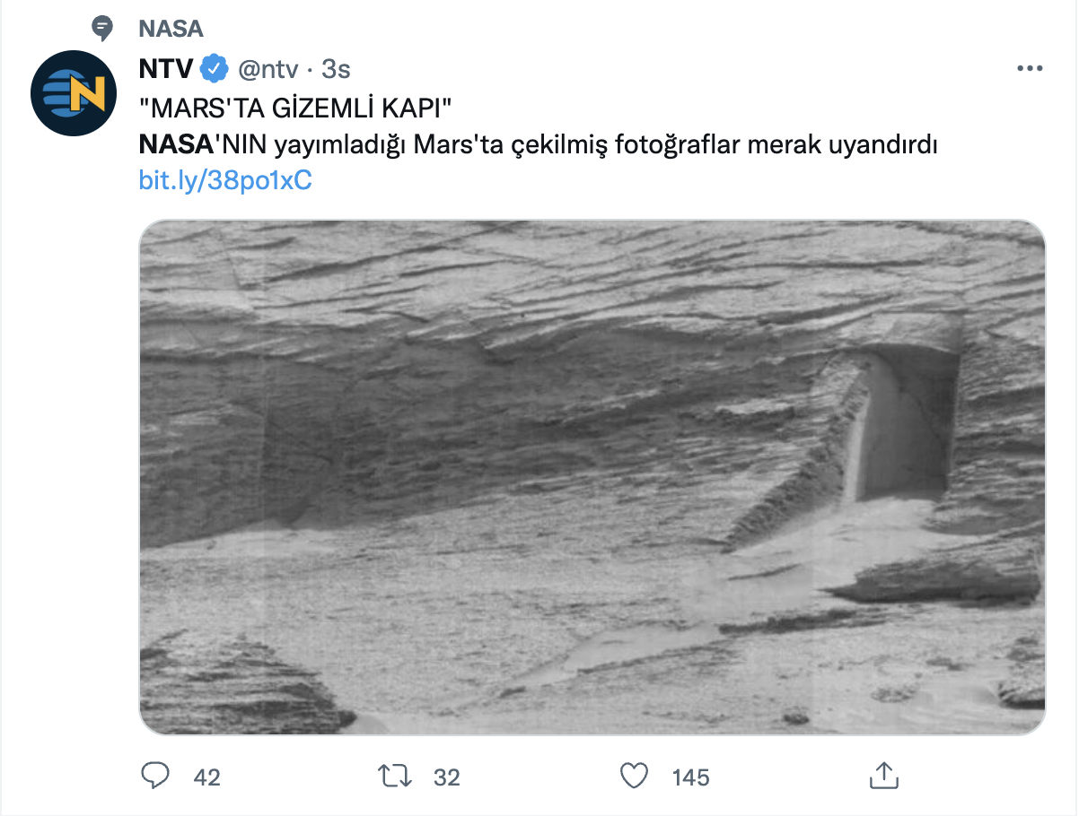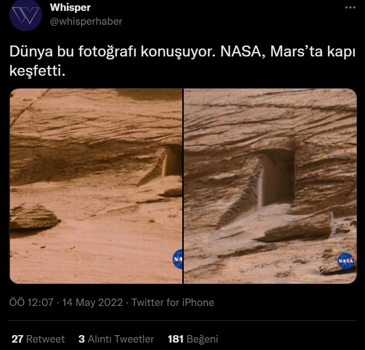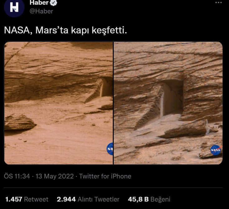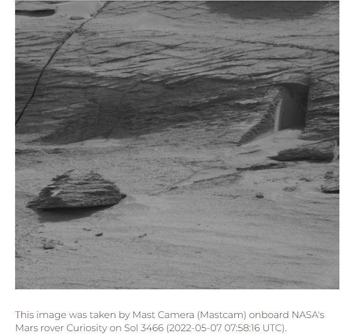 - Söz konusu görüntü, 7 Mayıs 2022’de NASA Curiosity gezici aracı tarafından kaydedilmiş. NASA Jet Propulsion Laboratuvarı yetkilileri doğrulama kuruluşu Snopes’a iddialarla ilgili değerlendirmelerde bulunmuş. Yetkililer fotoğrafın, kapı benzeri bir kaya yarığını gösterdiğini belirtmiş. Bunun yanında yarık boyutunun 30 cm- 45 cm olduğunun altını çizmiş.