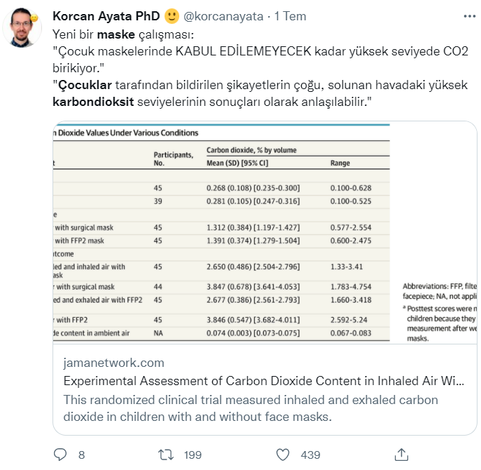 Bir süredir sosyal medyada korona virüsten korunmak için yüz maskesi takan çocukların tehlikeli seviyelerde karbondioksite maruz kaldıklarına dair iddialar gündeme geliyor. Aralarında ünlü isimlerin de bulunduğu birçok sosyal medya kullanıcısı, çocuk maskelerinde yüksek oranda karbondioksit biriktiğini iddia ediyor. Yoğun ilgi gören söz konusu iddiaya dair paylaşımlar konuşulup tartışılmaya devam ederken, özellikle ebeveynler çocukları için kaygılandıklarını dile getiriyor. Maske kullanımının yasaklanmasını talep edenler kadar iddiaya şüphe ile yaklaşıp, gerçekliğini sorgulayanlar da var. Detaylıca araştırdık. İşte iddiaya dair gerçekler.