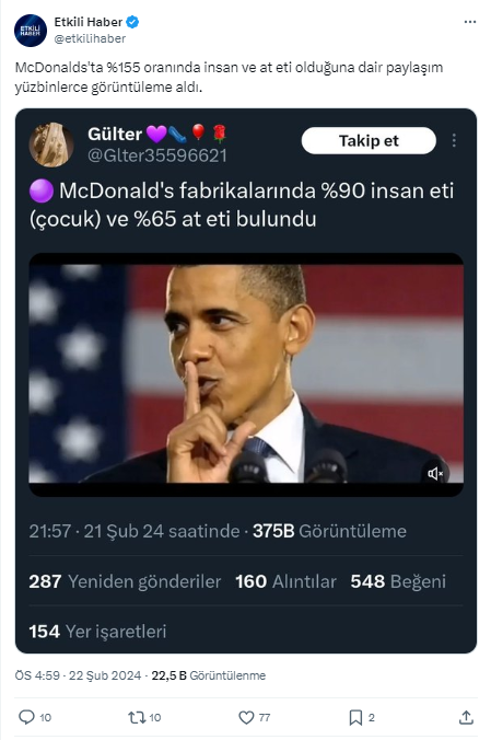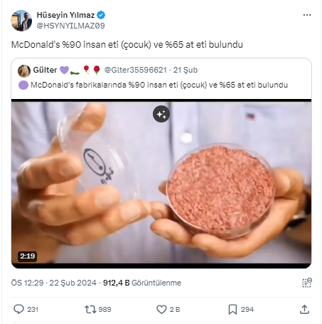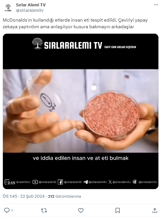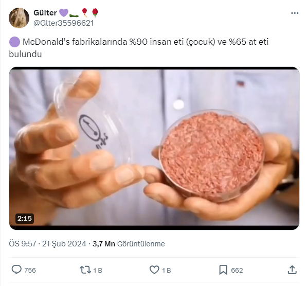 Bu nedenle, McDonald’s ve benzeri fast food restoranlara dair yıllardır pek çok iddia ve görüntü ortaya atıldı. Et üretiminin nasıl yapıldığına, ürünlerin hiç bozulmadığına dair veya hangi hayvanın etinden yararlanıldığına dair birçok iddiaya internet üzerinden ulaşmak mümkün. Yine benzer şekilde, X’te (Twitter) bir kullanıcı McDonald’s fabrikalarında %90 insan eti (çocuk) ve %65 at eti bulunduğunu iddia etti. Kişi, paylaşımına bir de video ekledi. Video ABD başkanlarından çiğ et görüntülerine kadar pek çok farklı fotoğrafın birleştirilmesiyle oluşturulmuş. Yani, sıradan biri tarafından rahatlıkla üretilebilecek bir video. Görüntülerin altına yerleştirilen sesli anekdotta ise Oklahoma City’deki McDonald’s fabrikasında insan eti ve at eti bulunduğundan bahsediliyor. Ayrıca bu etlerin restoranlara ulaştırılmak üzere kamyonlara yüklendiği bilgisinden ve FBI ajanı Lloyd Harrison’ın insan etlerinin ‘çocuk’ eti olduğunu söylediğinden bahsedilmiş.