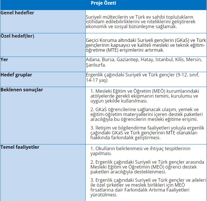 - Bu proje, Suriyeli ve Türk ev sahibi toplulukların sosyal ve ekonomik bağlamda uyumunu, yeterliliklerini iyileştirmeyi ve mesleki eğitime teşvikini amaçlıyor.