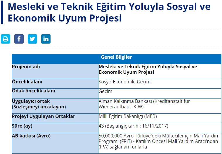 Söz konusu söylemi, Avrupa Birliği Türkiye Delegasyonu’nun AB Projelerinin yer aldığı kategoride araştırmaya devam ediyoruz. Mesleki ve Teknik Eğitim Yoluyla Sosyal ve Ekonomik Uyum Projesi’nde belirtilen hedef grup kitlesinin, Suriyeli ve Türk gençler (14-17 yaş) olduğu belirtilmiş. İlgili projenin 16/11/2017 tarihinden itibaren yürürlüğe girdiği görülüyor. Projenin iddia edilenin aksine sadece Suriyeli öğrencilere yönelik olmadığı, Türk öğrencileri de içerisinde barındırdığını detaylarda görmek mümkün.