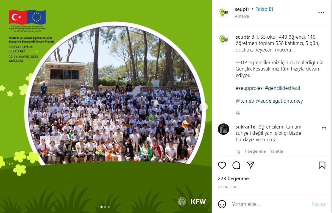 SEUP projesinin Instagram hesabından, 9 Mayıs’tan bu yana gerçekleştirilen festivalden görüntüler paylaştığı sonucuna ulaştık. Instagram hikayeleri incelendiğinde, paylaşım yapan öğrencilerden edindiğimiz bilgiler doğrultusunda festivalde sadece Suriyeli öğrenciler değil, Türk öğrencilerinin de bulunduğu anlaşılıyor.