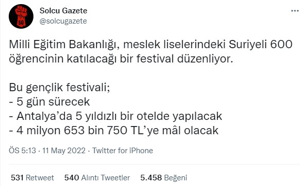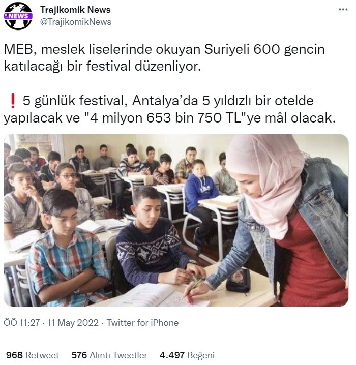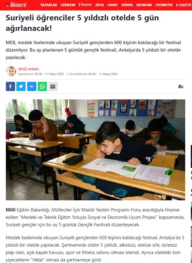 Sığınmacılarla ilgili tartışmalar gündemden düşmezken birçok yeni iddianın ortaya atıldığını görüyoruz. Şu sıralar Sözcü’nün yapmış olduğu haber doğrultusunda, MEB’in kendi bütçesinden meslek liselerinde okuyan 600 Suriyeli öğrenciye yönelik Antalya’da 5 yıldızlı otelde 5 günlük bir gençlik festivali düzenleneceği söylenmişti.