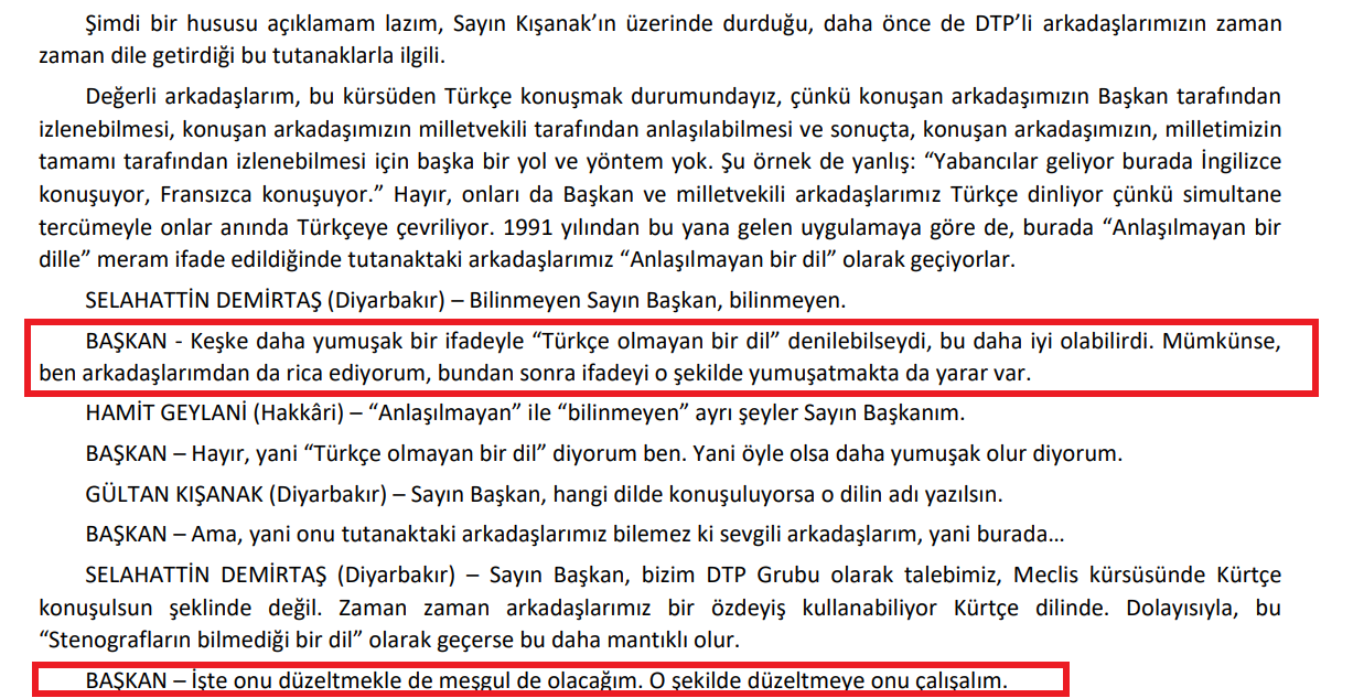 “… TBMM’de kürsüde konuşulur. İngilizce yazar parantez içinde bu söz İngilizce’dir, cümle İngilizce’dir. Fransızca söz Fransızca’dır vesaire. Konuşma metninin içinde Kürtçe bir dil geçtiği zaman ‘bilinmeyen bir dil’ deniyor. Ya Allah aşkına bu ülkenin insanların vicdanına sesleniyorum. TRT’nin TRT Kurdî diye bir yayını var, bir kanalı var. Yayın yapıyor bu. Nasıl olur da buraya bilinmeyen bir dil diye yazıyorsunuz? …”