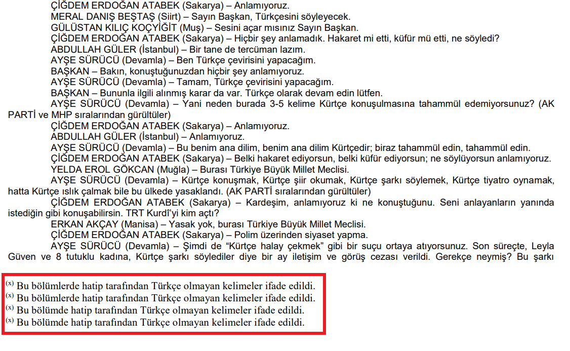 Örneğin 8 Aralık 2021 tarihinde HDP Şanlıurfa Milletvekili Ayşe Sürücü de kürsü de Kürtçe konuşmuş ve bu kısım Meclis tutanaklarına ‘Hatip tarafından Türkçe olmayan kelimeler ifade edildi’ şeklinde geçmişti.