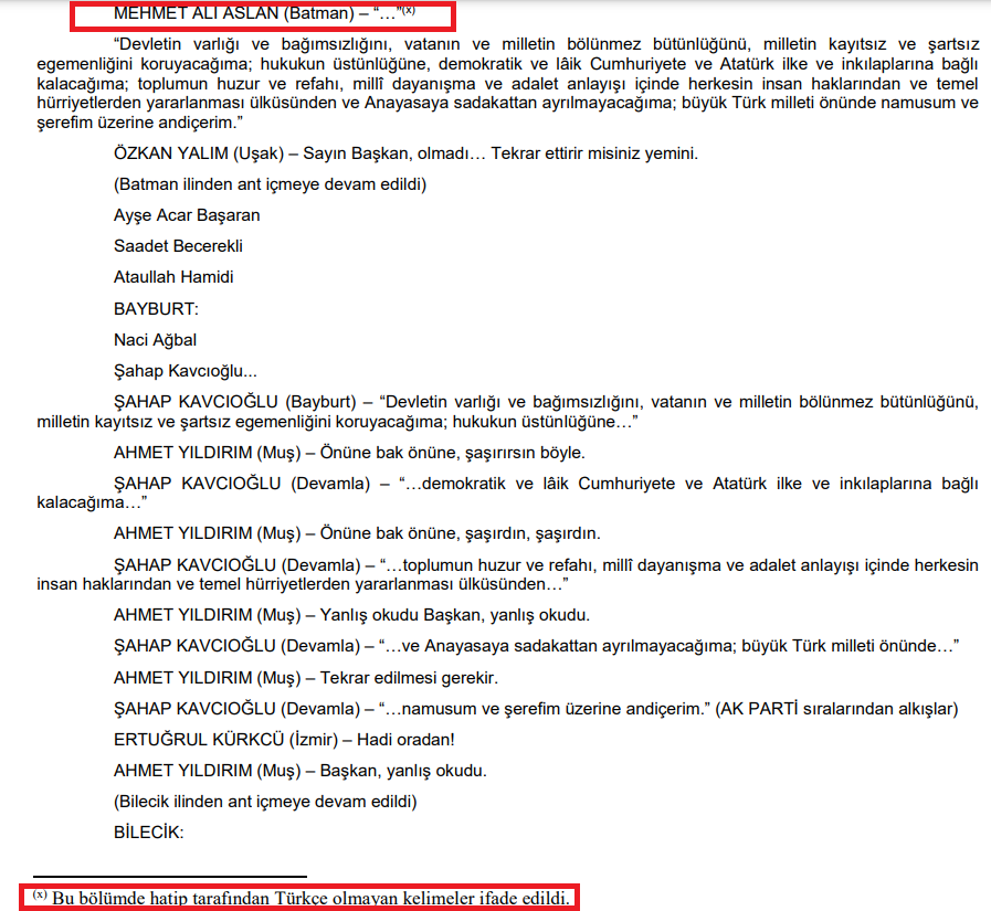 17 Kasım 2015 tarihli Meclis oturumunda dönemin HDP Batman Milletvekili Mehmet Ali Aslan milletvekili yeminine Arapça sözler ile başlamıştı. İlgili kısmın tutanakta ise diğer yabancı diller gibi ‘Hatip tarafından Türkçe olmayan kelimeler ifade edildi’ şeklinde geçtiği görülüyor.