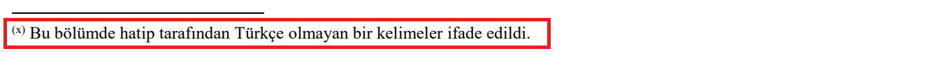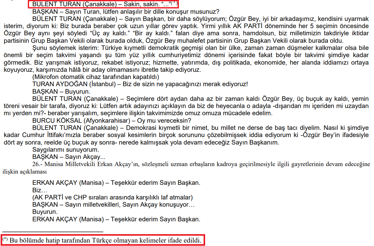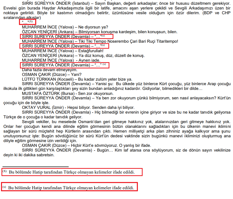 - Meclis tutanaklarında Türkçe haricinde konuşulan yerler için “Bu bölümde hatip tarafından Türkçe olmayan kelimeler ifade edildi.” ibaresi yer alıyor.