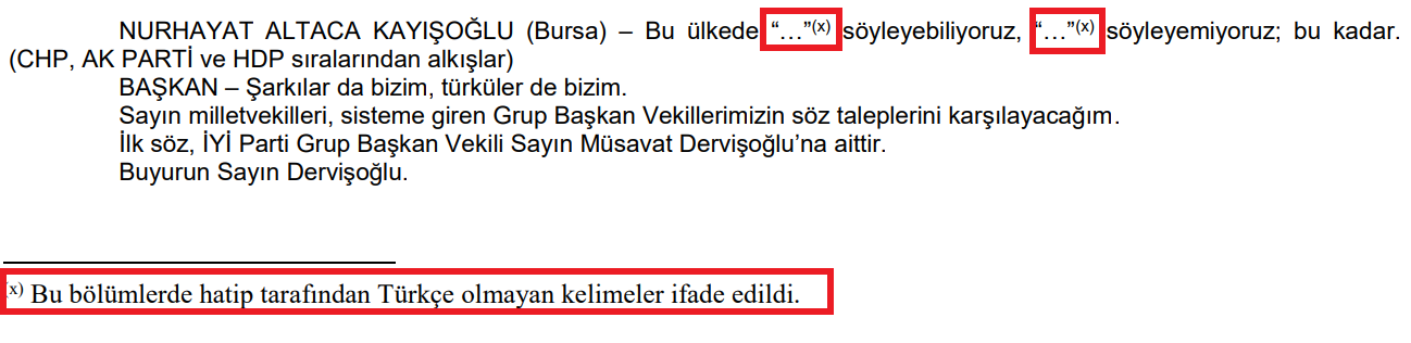 17 Mayıs 2022 tarihinde CHP Bursa Milletvekili Nurhayat Altaca Kayışoğlu konuşmasında önce İngilizce sonra Kürtçe bir şarkıyı seslendirdi. O günün meclis tutanağına baktığımızda vekilin söylediği şarkıların her ikisinin de ‘Hatip tarafından Türkçe olmayan kelimeler ifade edildi’ şeklinde yer aldığı görülüyor.