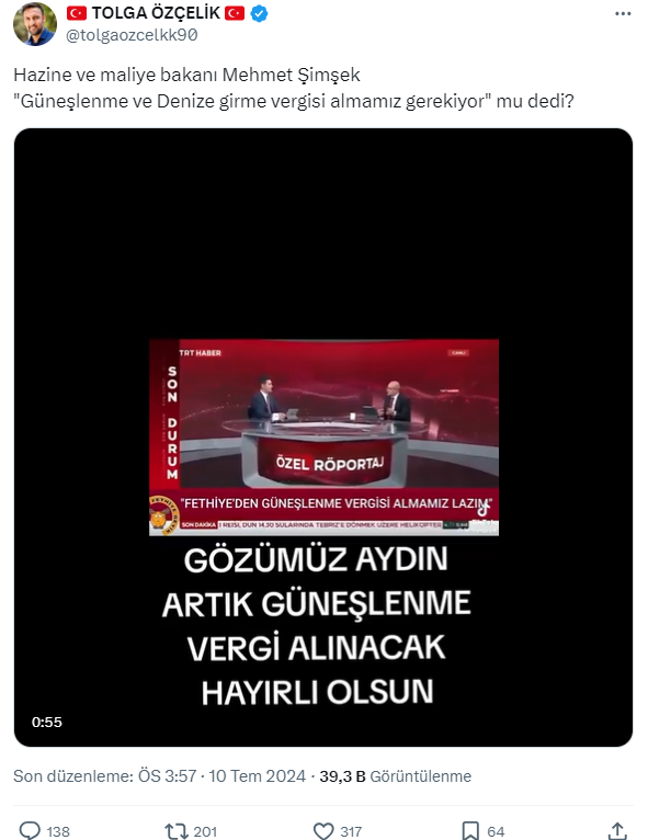 Sosyal medyada, Hazine ve Maliye Bakanı Mehmet Şimşek’in katıldığı televizyon programında güneşlenme ve denize girme vergisi alınması gerektiğini söylediği iddiasıyla bir videoda paylaşıldı. Kısa sürede dolaşıma giren videoyu inceledik.