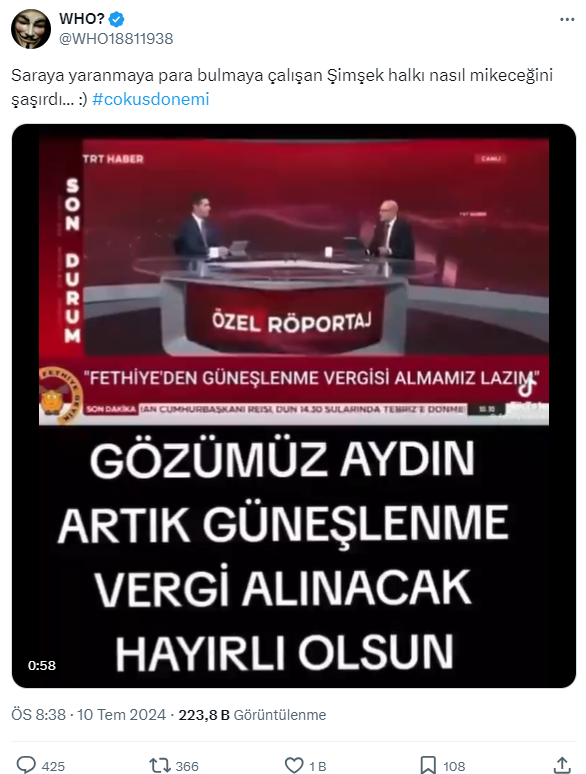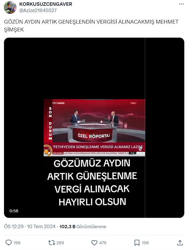 Hesabın yüklediği videonun başında Demokrat Parti Genel Başkan Yardımcısı Cemal Enginyurt’un 9 Haziran 2024’te sosyal medya hesabından yaptığı ve Mehmet Şimşek’e “Güneş bugün çok güzel. Vergi almayı düşünüyor musun?” diye seslendiği görüntü de eklenmiş.