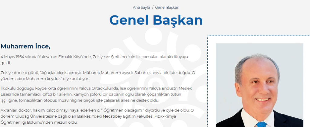 Paylaşımlardan birisinde Muharrem İnce’nin istifasının ardından ifadesi yer alıyor ancak Muharrem İnce’nin Memleket Partisi’nden istifası söz konusu değil. Memleket Partisi’nin web sitesini ziyaret ettiğimizde Muharrem İnce’nin hala genel başkan olduğu görülüyor.