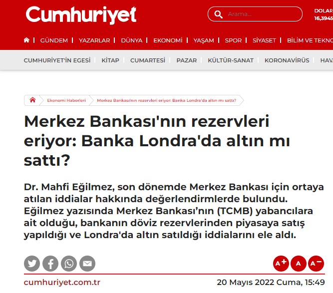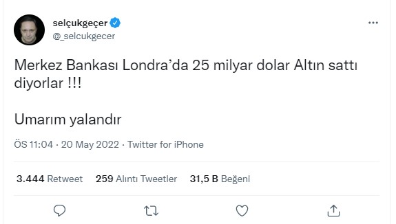 19 Mayıs 2022’de Bloomberg’in paylaştığı bir haberde Birleşik Krallık Merkez Bankası yaptığı altın satışı 1 doların altına düştüğü söyleniyor. Haberde bu düşüşün, bazı merkez bankalarının varlıklarını sattığının işareti olabileceğini aktardı. Bunun üzerine Türkiye’de pek çok sosyal medya kullanıcısı ve haber sitesi bu satışı Türkiye Cumhuriyet Merkez Bankası’nın yapmış olabileceğini ileri sürdü.
