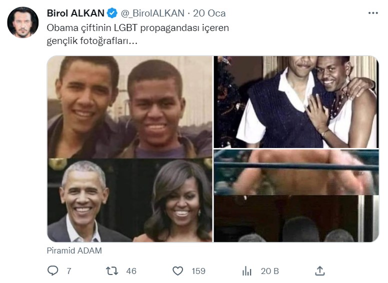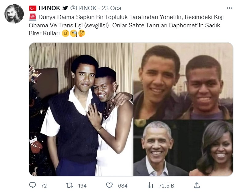 Twitter’da bazı hesapların paylaştığı görsel, yaklaşık 100 bin görüntülenme aldı. Söz konusu gönderilerde, ABD’nin 44. Devlet Başkanı Barack Obama ve eşi Michelle Obama yer alıyor. İddia sahipleri, Michelle Obama’nın fotoğraflardaki görünümünden yola çıkarak ‘transseksüel olduğunu’ öne sürüyorlar. Sadece Türkiye’de değil, birçok yabancı kullanıcı tarafından da kendisinin sözde “trans kadın” olduğu iddiası dolanıyor.