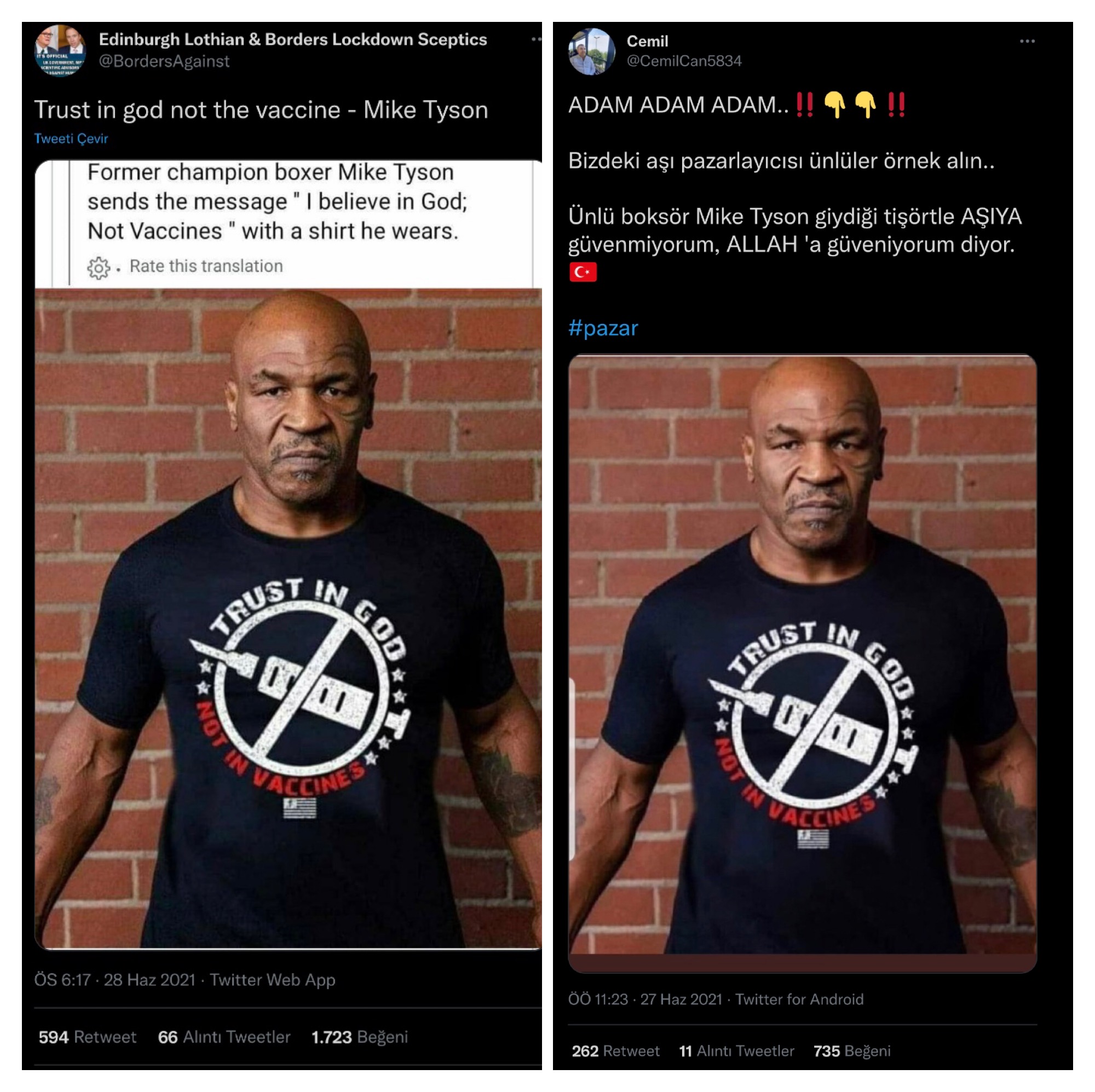 Yerli ve yabancı birçok haber mecrasında ve sosyal medya platformlarında paylaşılan, dünyaca ünlü boksör Mike Tyson’ın “Tanrıya güveniyorum, aşılara değil” yazılı tişörtü ile aşı karşıtı mesaj vermek için poz verdiği iddia edilen fotoğrafı gündem oldu. İlgi uyandıran fotoğraf aşı karşıtları tarafından sözde örnek davranış olarak kabul ederek büyük oranda destek aldı. Sosyal medya kullanıcıları beğeni ve yorumlar ile Tyson’ın aşılara karşı mücadelesini takdir etti. Tyson hayranları ve onu yakından takip edenler ise fotoğrafın geçmişe ait olduğunu ve tişörtünde farklı bir baskı bulunduğunu iddia etti. Tyson tişörtü ile aşı karşıtı bir propaganda yapmış olabilir mi? Tüm iddiaları araştırarak ve her açıdan değerlendirerek gerçeği sizler için araştırdık.