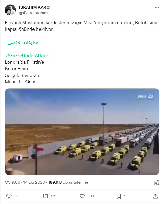 Çeviriye göre Mısır Cumhurbaşkanı Sisi Mısır halkı adına insani yardım yüklü 56 TIR’ı Gazze Şeridi sakinlerine ulaştırmış.