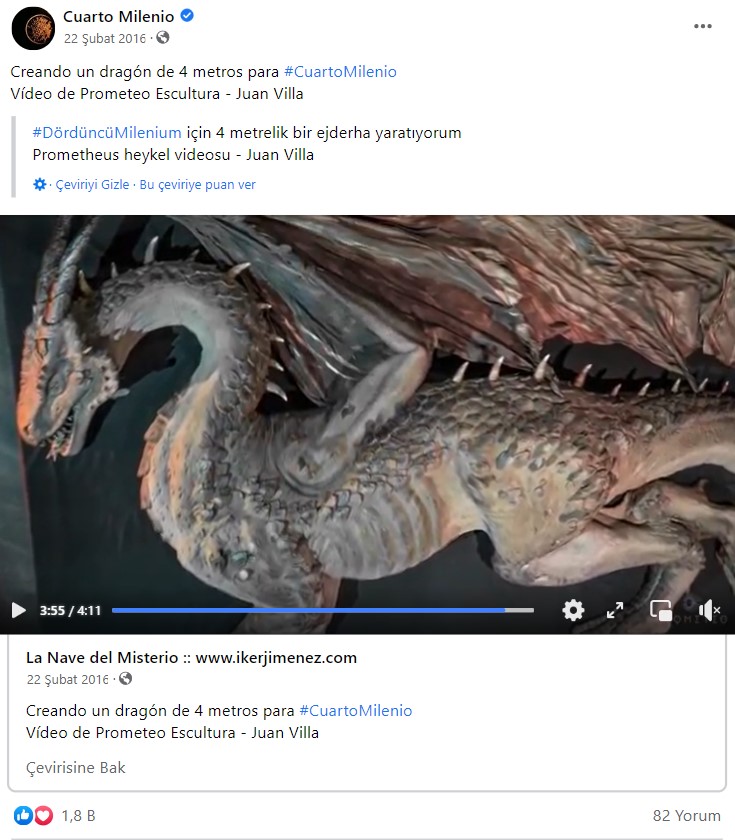 Herrero, videonun altına “Bu şekilde, Cuarto Milenio TV programı için atölyemizde adım adım 4 metreden uzun bir ejderha yarattık.” şeklinde bir açıklama yazmış.