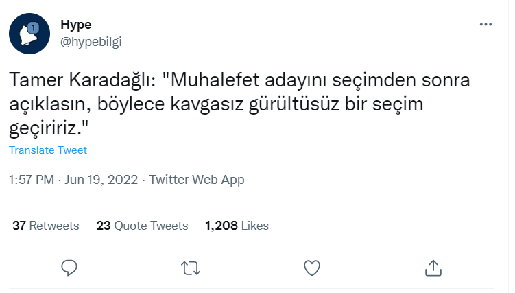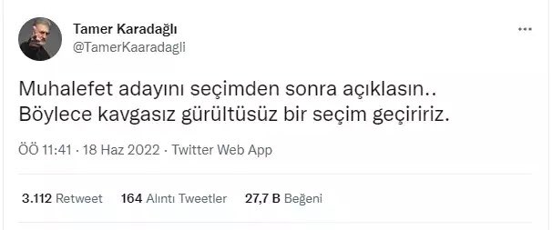 Geçtiğimiz günlerde Twitter’da @TamerKaaradagli kullanıcı adıyla yapılan “Muhalefet adayını seçimden sonra açıklasın, böylece kavgasız, gürültüsüz bir seçim geçiririz,” paylaşımı tartışma konusu oldu.