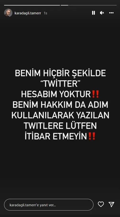 Paylaşımın yayılmasının ardından aktör Tamer Karadağlı, Instagram hesabında paylaştığı hikayede, sözü geçen Twitter hesabı ve paylaşımın kendine ait olmadığını açıkladı.