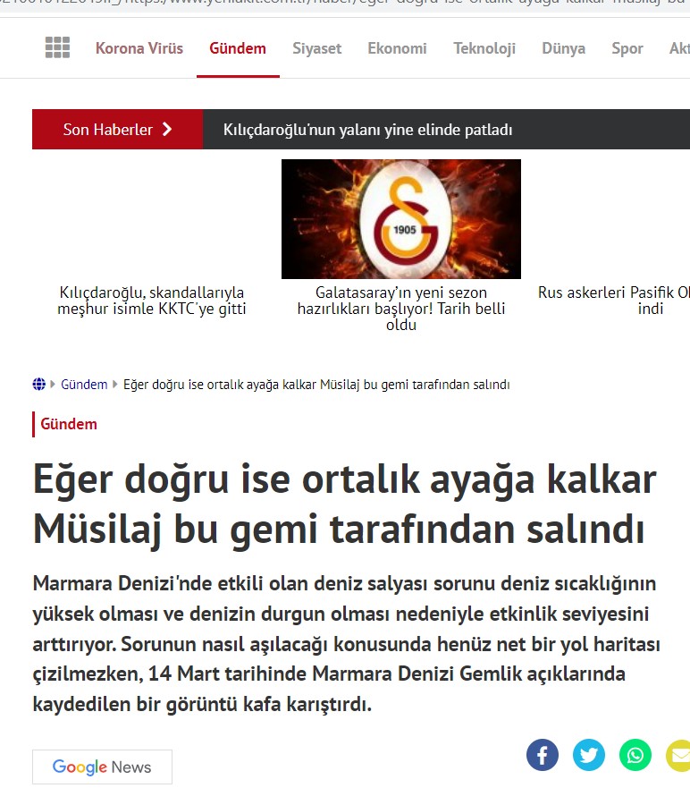 Bazı haber siteleri 14 Mart 2021’de Demirören Haber Ajansı tarafından servis edilen görüntüyü yeniden paylaştı. Söz konusu videoda bir yük gemisinin Marmara Denizi açıklarında kimyasal madde saldığı görülüyor. Haber sitelerinde, bu maddenin müsilaja sebep olduğu yönünde yorumlara yer verildi. Söz konusu iddia hakkında Ekşisözlük’te de başlık açıldı.