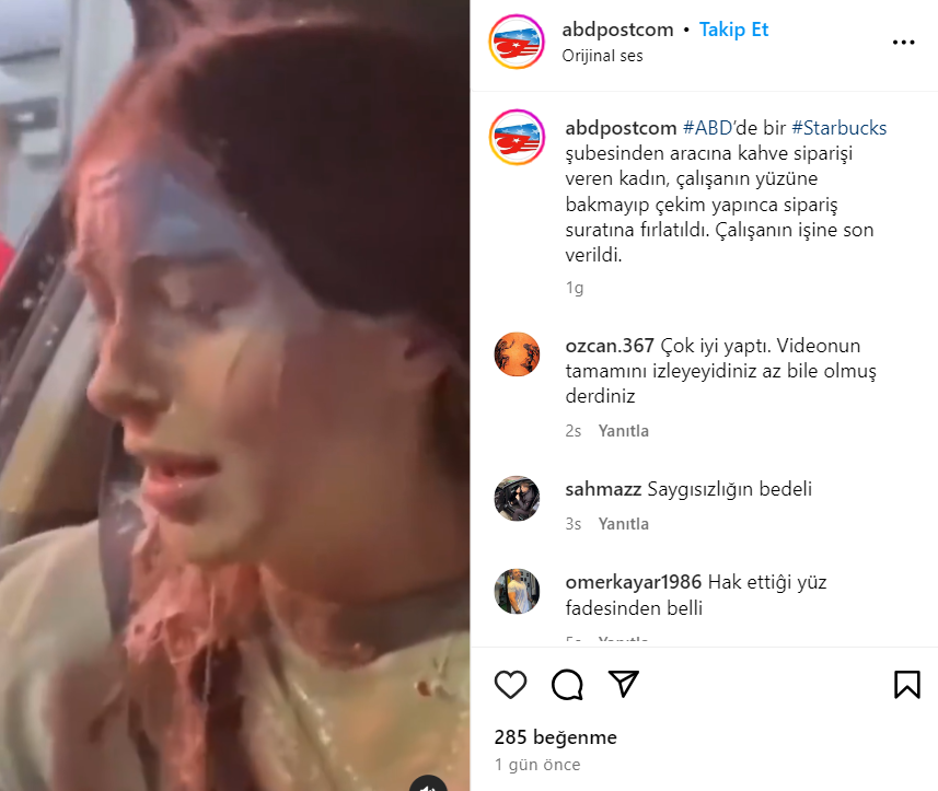 Sosyal medyada ve haber sitelerinde yer alan videolu bir habere göre sipariş esnasında sözde Starbucks çalışanının yüzüne bakmayan müşteriye, personel tarafından kahve fırlatılmış. Bu hareketi yapan personel ise işten çıkarılmış.