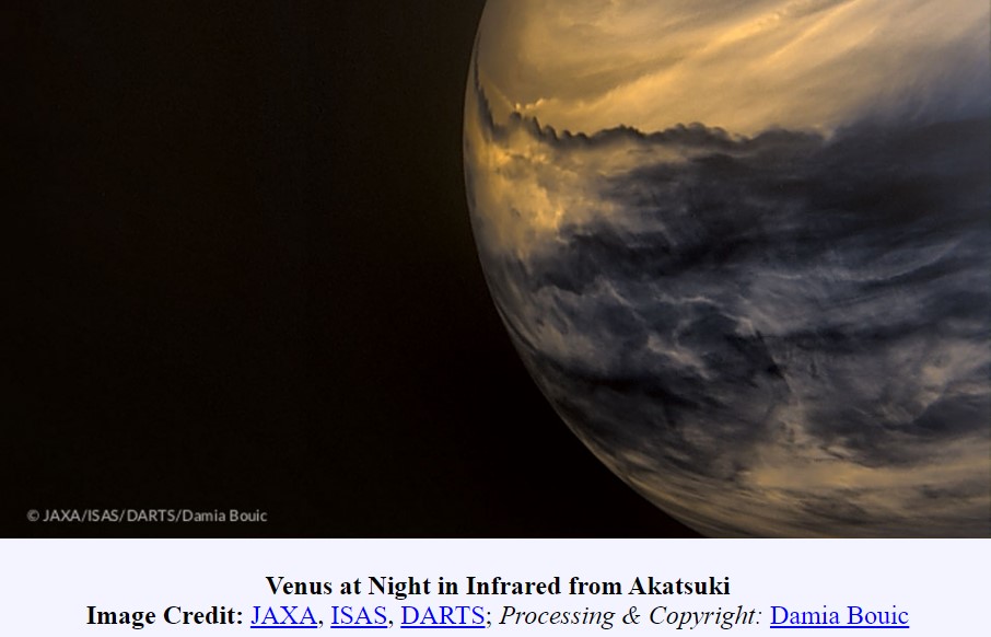 NASA’nın 30 Ocak 2018’de web sitesine taşıdığı bu fotoğraf, ‘Akatsuki’den Kızılötesi Venüs’ün Gecesi’ ismiyle paylaşılmış.
