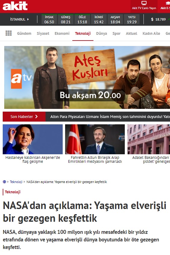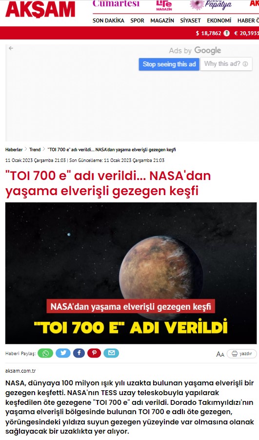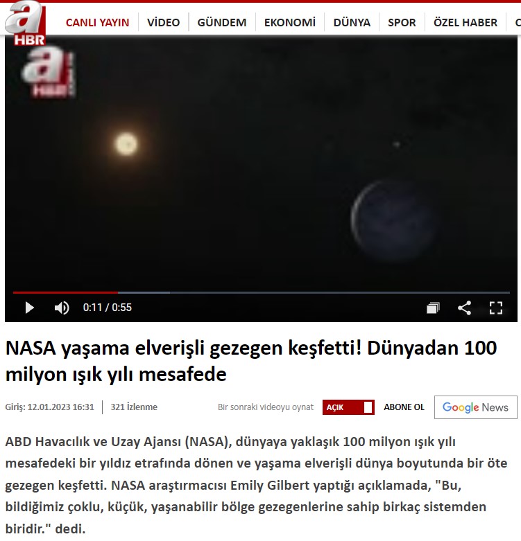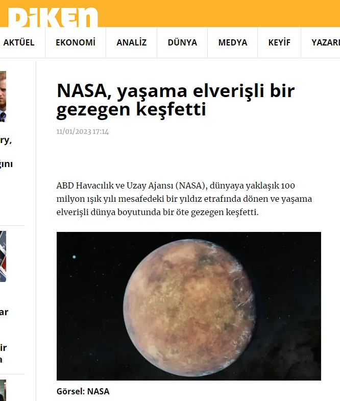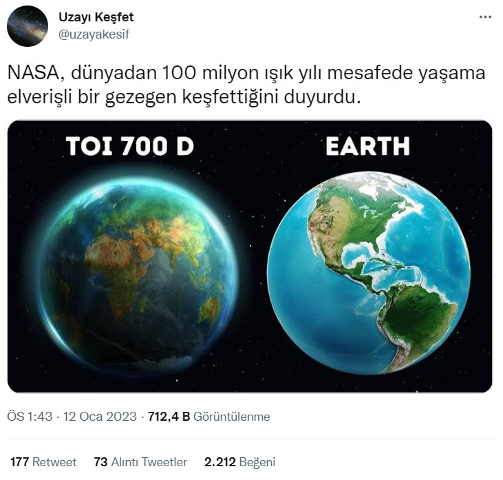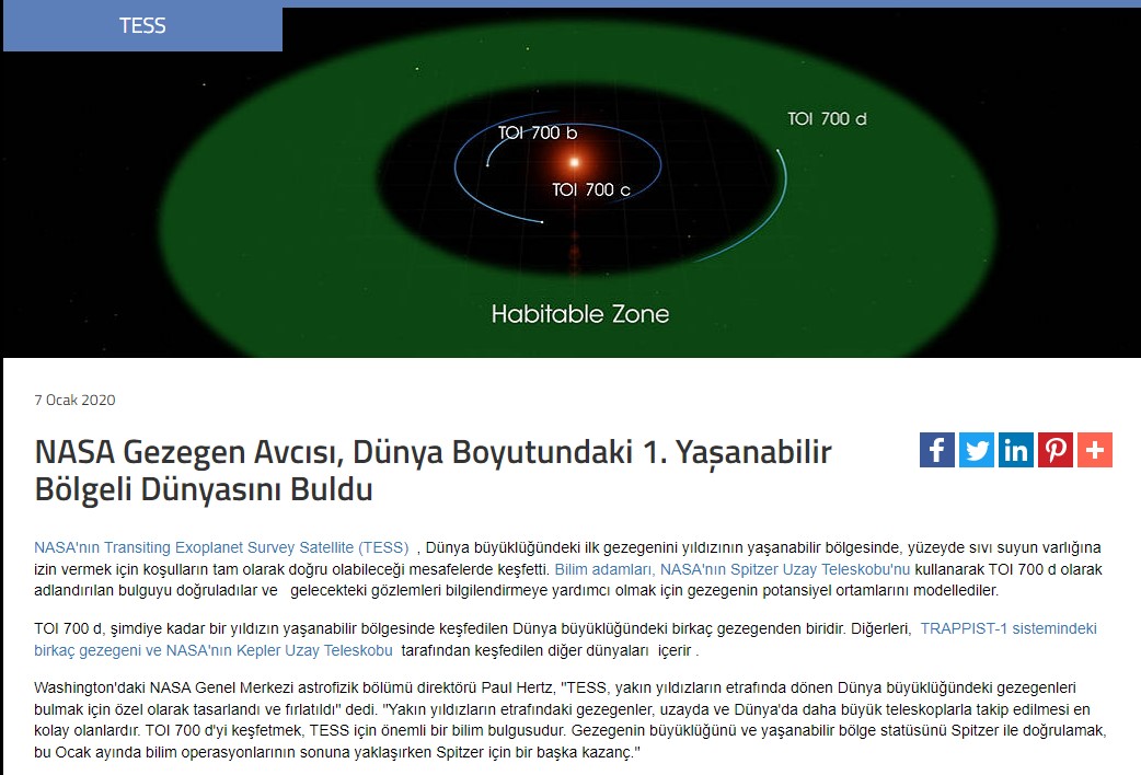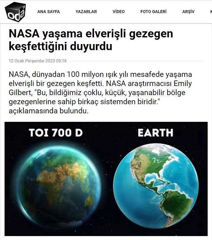 Haber kanalları tarafından 100 milyon ışık yılı uzaklıkta, tıpkı dünyamız gibi yaşama elverişli bir gezegen keşfedildiğine dair yaymış olduğu bir bilgi kısa sürede ilgi odağı haline gelmişti. Bu haberin doğruluğunu araştırmak için öncelikle “NASA”, “Exoplanet”, “TOI 700” gibi İngilizce anahtar kelimelerle konuyu etraflıca incelediğimizde, işbu gezegen grubunun bundan üç yıl önce yani 2020’de keşfedildiğini görüyoruz. TOI 700 grubunda bulunan B,C,D ve E gezegenleri arasında TOI 700 e’nin yaşama elverişli olabileceği söyleniyor. NASA’nın, daha önce Dünya benzeri, yaşama elverişli olabileceğini açıkladığı ilk gezegen ise, yine TOI 700 grubunda bulunan TOI 700 d’ydi.