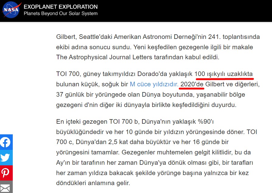 - NASA’nın keşfettiği TOI 700 e isimli gezegen, 100 milyon değil, 101,4 ışık yılı uzaklıkta bulunuyor.