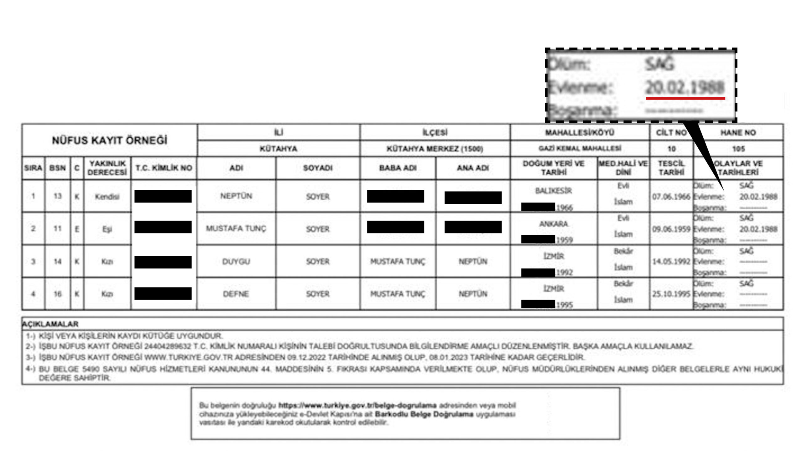 - Tunç Soyer’in eşi Neptün Soyer’e, İzmir Büyükşehir Belediyesi İletişim Birimi aracılığıyla ulaştık. Soyer, Nüfus Kayıt Örneğinin ekran görüntüsünü bizimle paylaştı. Belge görüntüsünde evlilik tarihinin, 20.02.1988 olduğu görülüyor. Belge, Soyer’in 22 yaşında evlendiği bilgisini doğruluyor.
