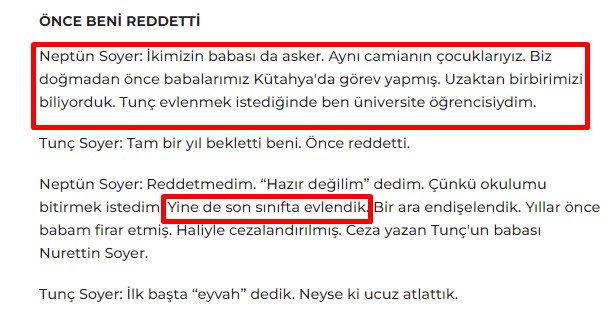 İddiaya ilişkin haber kaynaklarını taradığımızda da birçok yerde de Neptün Soyer’in üniversite son sınıfta evlendiği bilgisinin yer aldığını görüntülüyoruz.