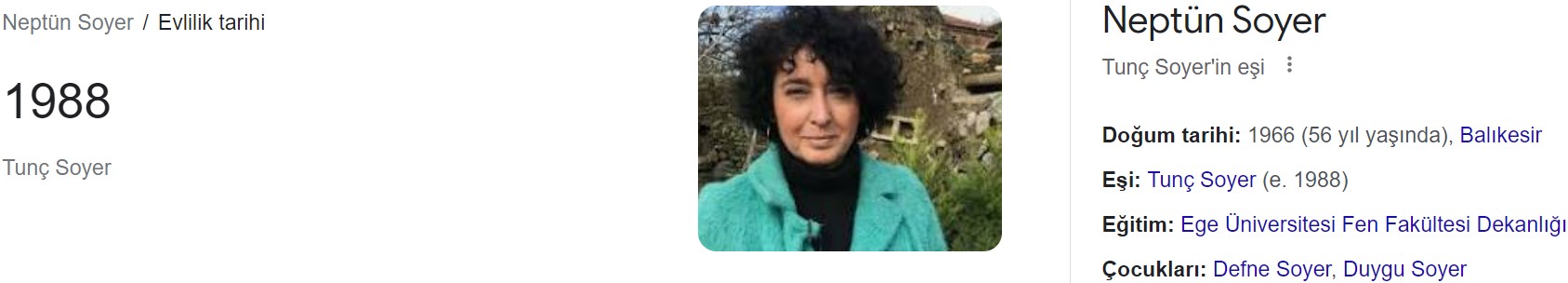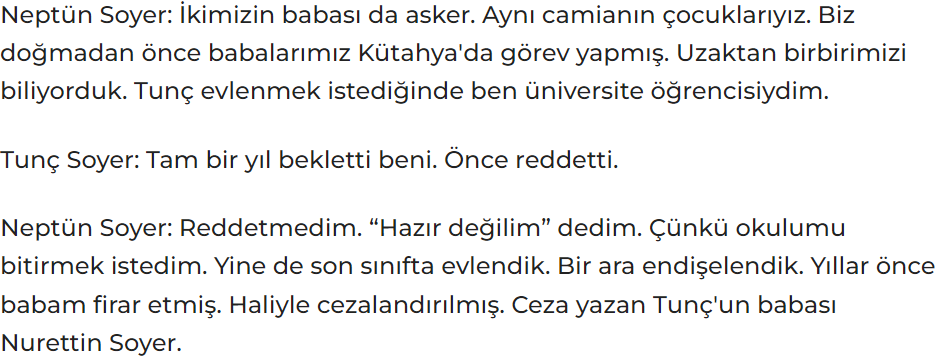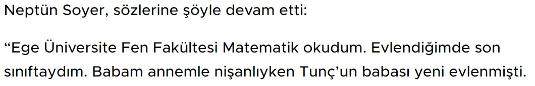 - Tunç Soyer’in eşi Neptün Soyer’in 14 yaşında evlendiğine dair bir açıklaması mevcut değil.