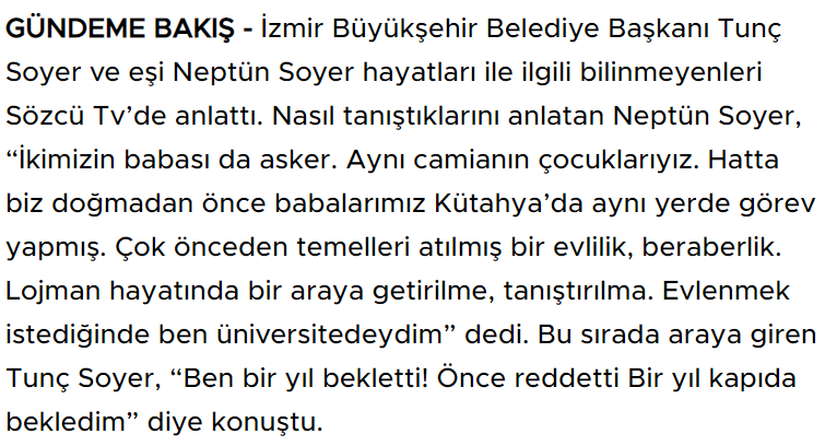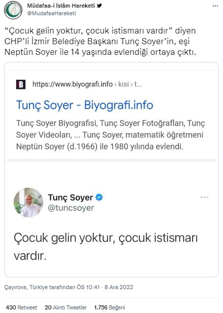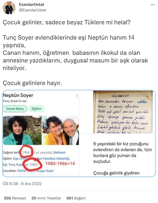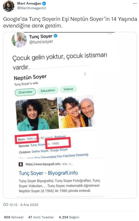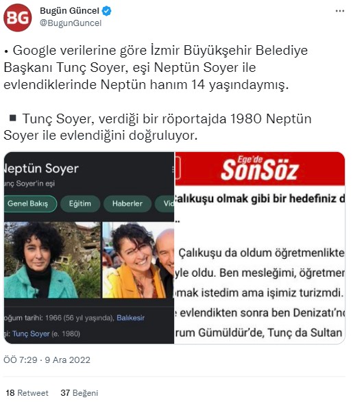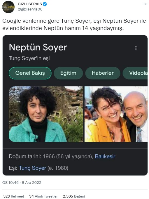 Sosyal medyada yayılımda olan gönderide, İzmir Belediye Başkanı Tunç Soyer’in eşi Neptün Soyer ile Neptün Soyer 14 yaşındayken evlendiği iddia edildi. Paylaşımlar kısa sürede yayıldı. İlgili konu, Ekşi Sözlükte ‘de “neptün soyer’in tunç soyer’le 14 yaşında evlenmesi” başlığıyla da gündeme geldi.