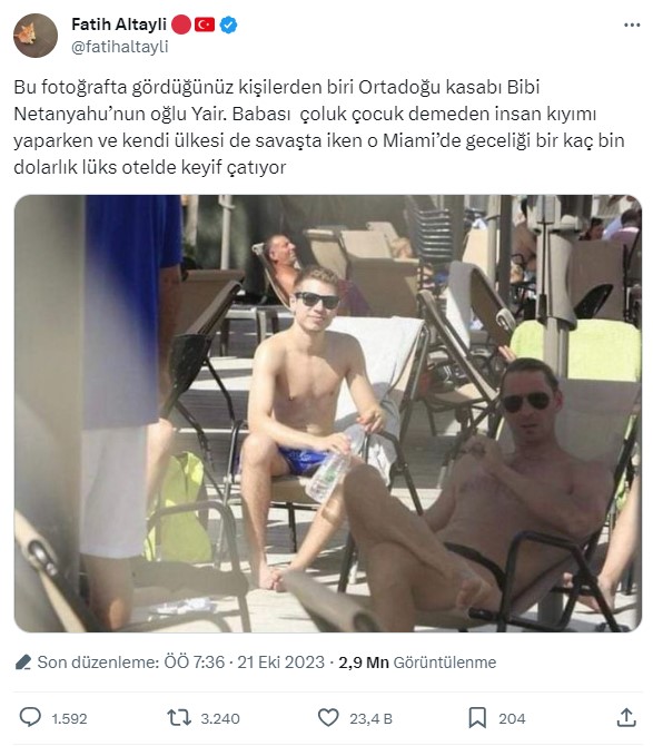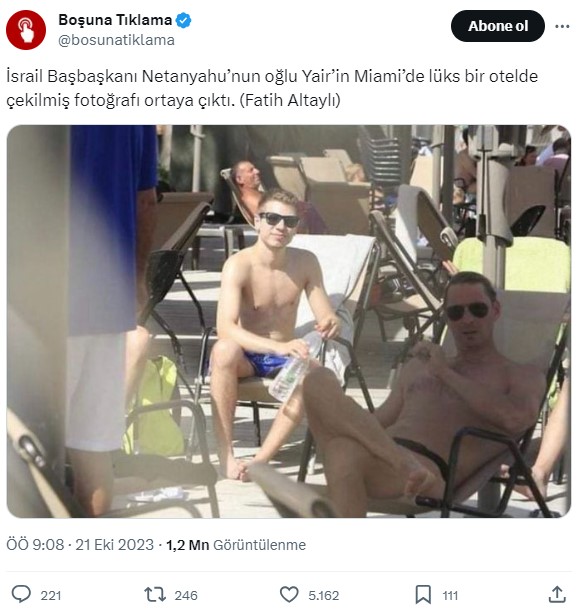 “Bu fotoğrafta gördüğünüz kişilerden biri Ortadoğu kasabı Bibi Netanyahu’nun oğlu Yair. Babası çoluk çocuk demeden insan kıyımı yaparken ve kendi ülkesi de savaşta iken o Miami’de geceliği bir kaç bin dolarlık lüks otelde keyif çatıyor.”