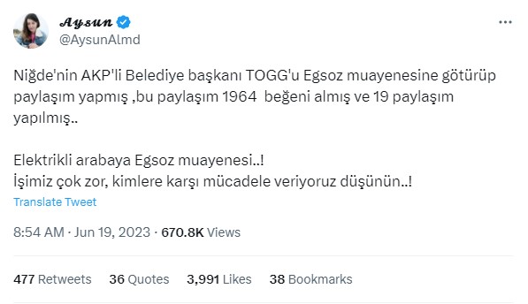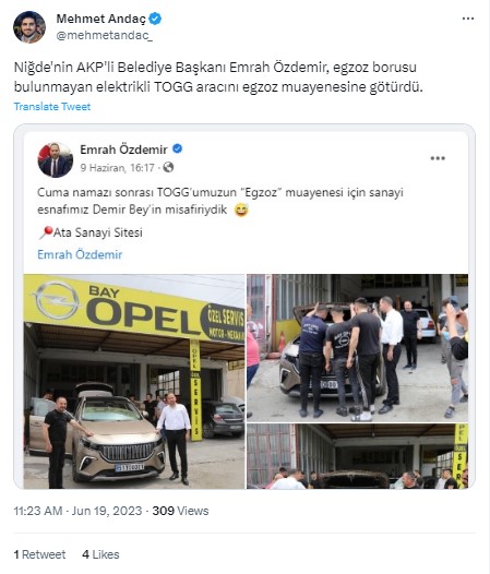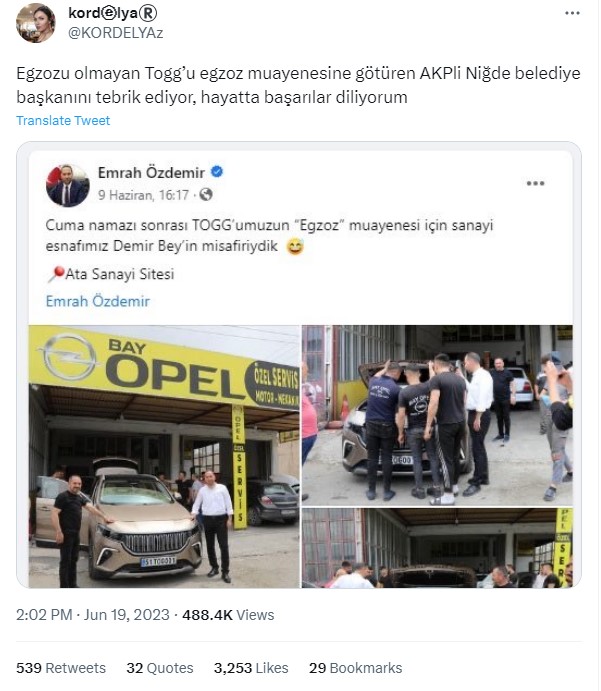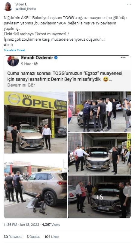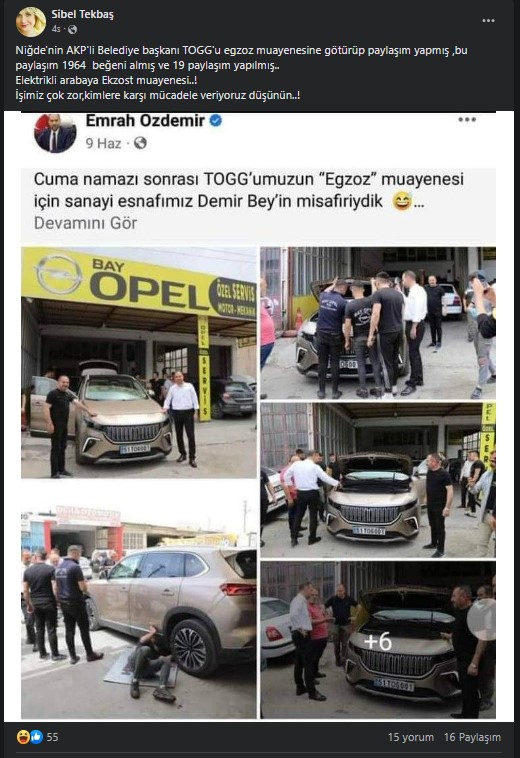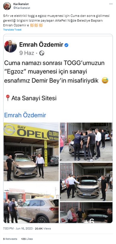 Niğde Belediye Başkanı Emrah Özdemir 12 Haziran 2023 günü tüm sosyal medya hesaplarından TOGG ile birlikte Ata Sanayi esnafını ziyaret ettiklerine dair paylaşımlar yapmıştı. Paylaşımına ‘Aramızda kalsın egzoz muayenesine geldik’ notu da ekleyen Özdemir’in paylaşımı çoğu sosyal medya kullanıcısı tarafından ciddiye alındı. Kullanıcılar Özdemir’in TOGG’u gerçekten egzoz muayenesine götürdüğünü düşündü.