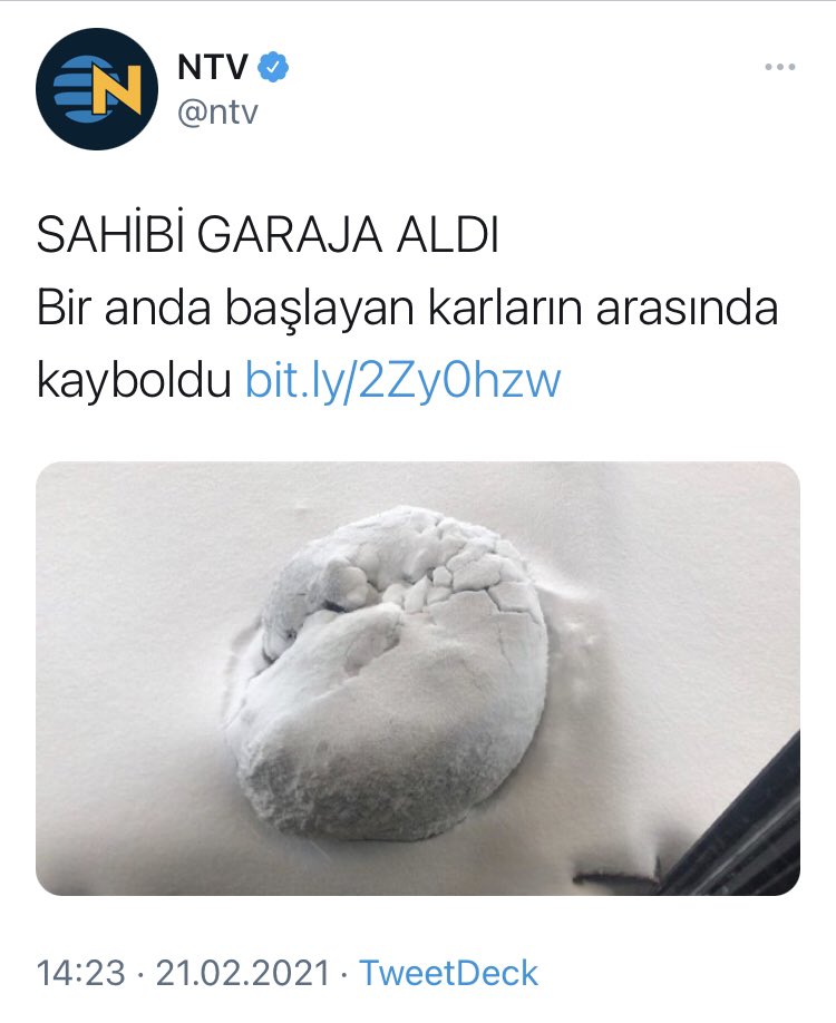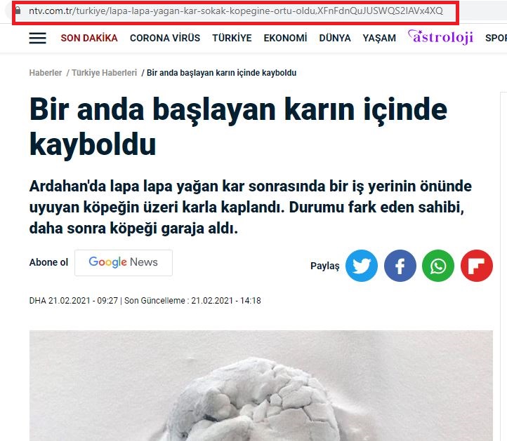 Bir Twitter hesabında 22 Şubat 2021 tarihinde yapılan bir paylaşımda NTV’nin “Lapa lapa yağan kar, sokak köpeğine ‘örtü’ oldu” başlığıyla bir haber paylaştığını ve daha sonra gelen tepkilerle birlikte haber başlığını değiştirdiğini iddia etmiştir. Söz konusu paylaşım 2.286 retweet, 62.931 beğeni almıştır.