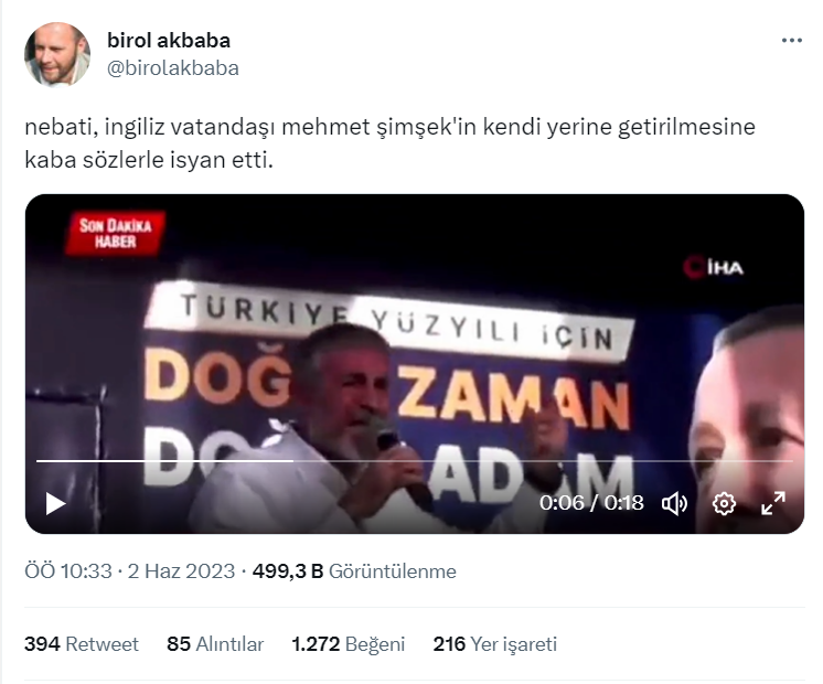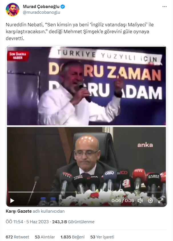 Dolayısıyla bu paylaşımda da görüldüğü üzere Nebati, miting konuşmasında Mehmet Şimşek’i değil Altılı Masa’nın Cumhurbaşkanı adayı Kemal Kılıçdaroğlu’nu ve Altılı Masa’nın diğer katılımcılarını kastettiği anlaşılıyor.