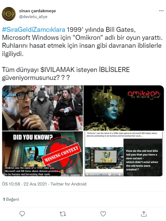 Sosyal medyada paylaşımda olan bir iddiaya göre Microsoft 1999 yılında Omikron isimli bir oyun çıkardı. İddiada oyunu Bill Gates’in hazırlattığı söyleniyor. Paylaşımlarda oyunun isminin Omikron: The Nomad Soul olduğu görülüyor. Ayrıca, oyunun geçtiği şehrin Omikron şehri olduğu ve oyunda insan gibi davranan iblislerin ruhları hasat ettiği söyleniyor. Bu iddia üzerine de Covid-19 Omicron varyantının önceden planlandığı iddia ediliyor.