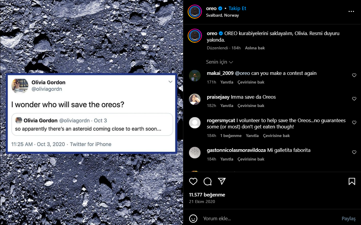 Olivia Gordon isimli bir X( eski adıyla Twitter) kullanıcısının, “Dünyaya asteroidin yaklaştığı söyleniyor, acaba Oreo’ları kim kurtaracak?” yazılı paylaşımının ardından, Oreo Instagram hesabı üzerinden, “Oreo kurabiyelerini biz kurtaracağız Olivia. Resmi duyuru yakında” şeklinde bir açıklama paylaşmış.