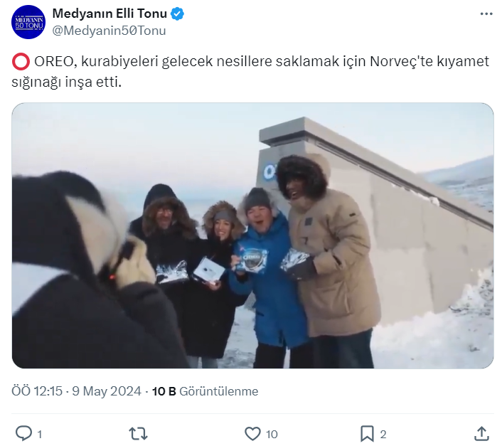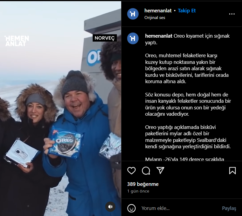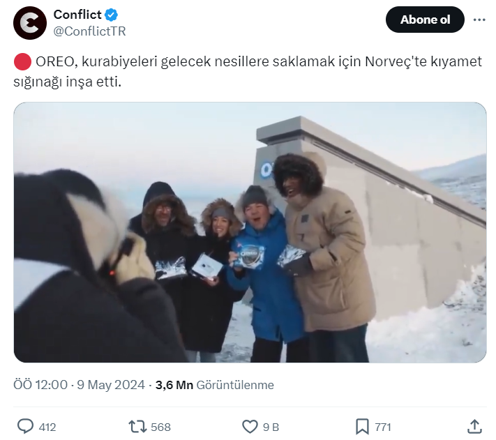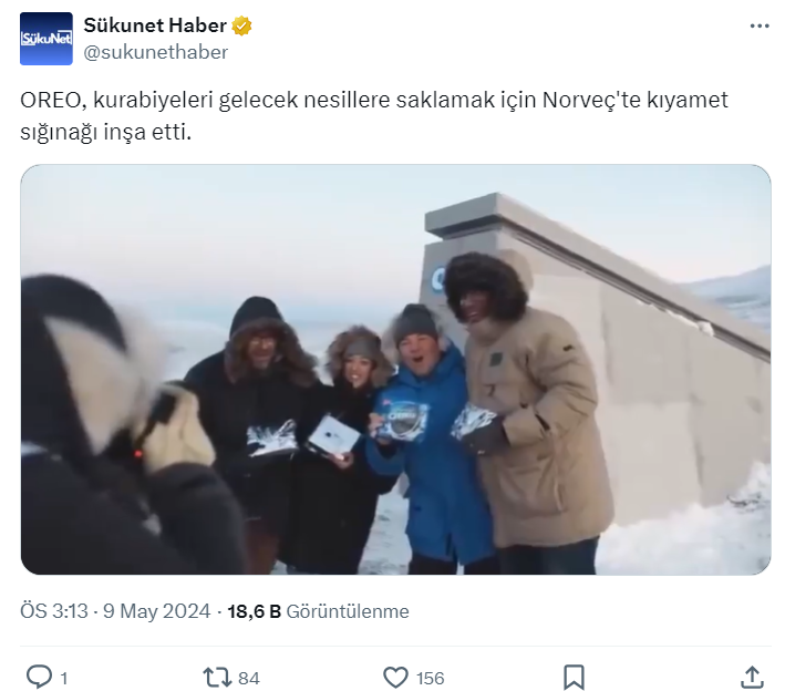 Sosyal medyada 9 Mayıs’tan bu yana yayılımda olan ve kısa süre içerisinde etkileşim alan bir paylaşımda Oreo’nun kurabiyeleri gelecek nesillere saklamak amacıyla Norveç’te “kıyamet sığınağı” inşa ettiği öne sürüldü. Yorumlarda, bazı kullanıcılar eleştirilerde bulunurken bazı komplo teorisyenleri ise bunun 3. Dünya Savaşı hazırlıkları olarak yorumladı.