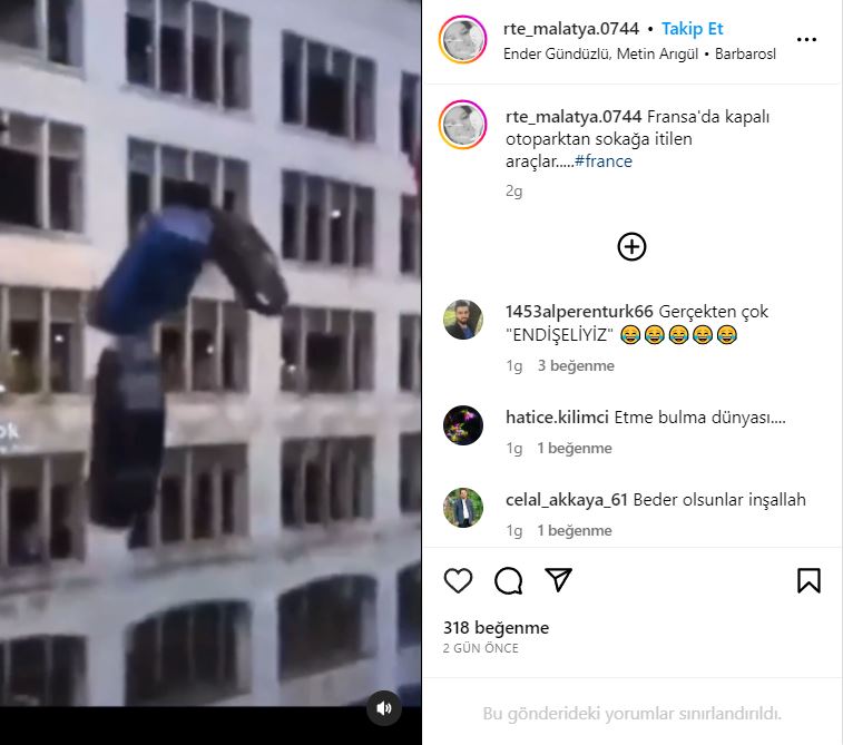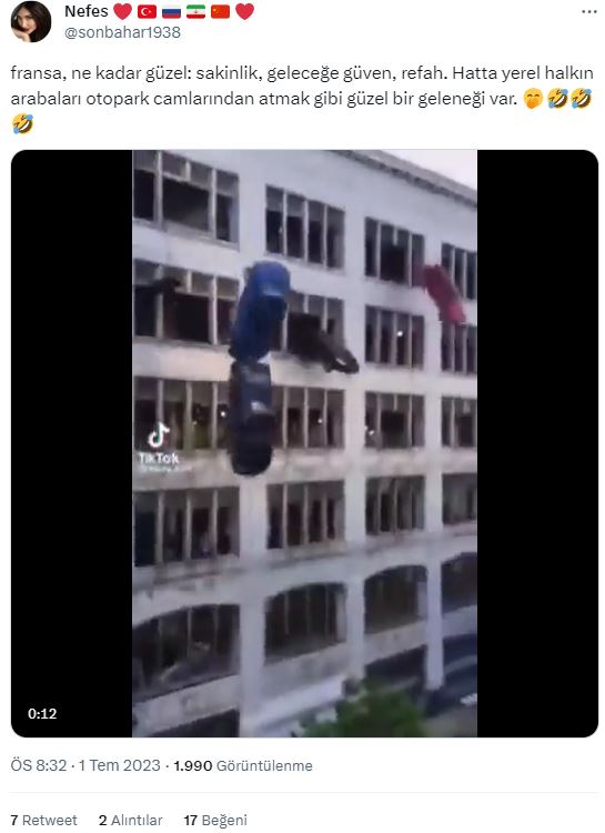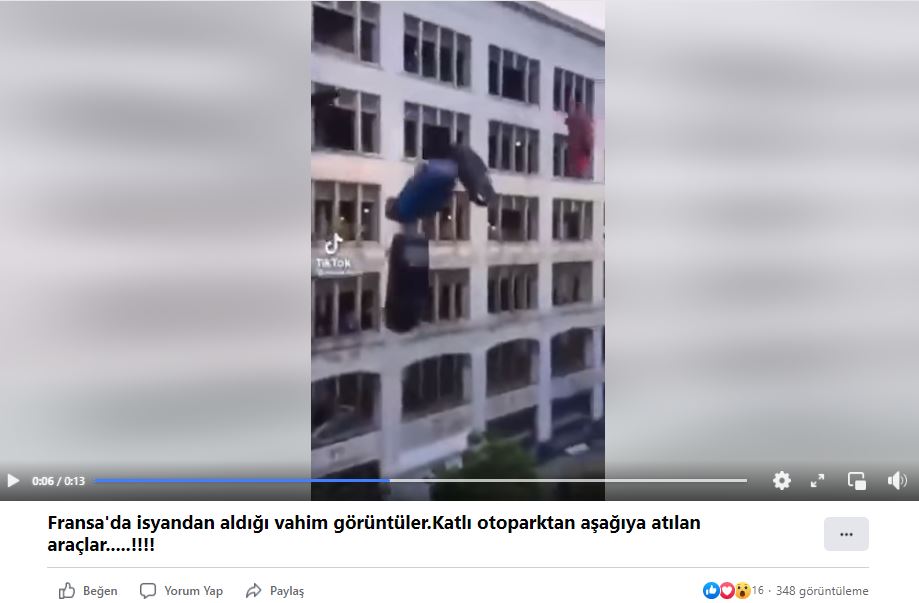 Son olarak otopark penceresinden atılan arabaların görüldüğü videonun Fransa’da yaşanan protestolar sırasında kaydedildiği öne sürüldü.