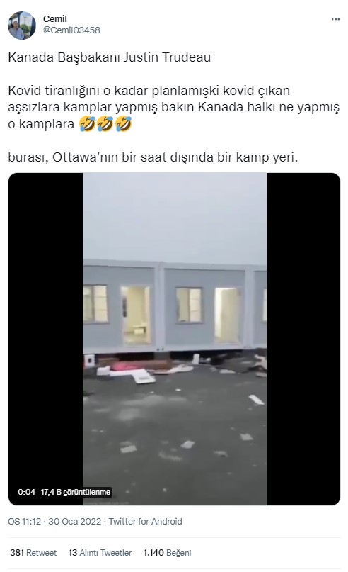Sosyal medyada yapılan bazı paylaşımlarda Kanada’nın başkenti Ottawa şehrinin yakınlarında bir aşısızlar için bir kamp kurulduğu ve Kanadalıların bu kampa saldırdığı iddia edildi. İddiayı ilk önce yabancı kullanıcılar paylaştı. Daha sonra Türkiye’de de paylaşıldı. İddiaya kaynak olarak ise bir video gösterildi. Videoyu aşağıdan izleyebilirsiniz.