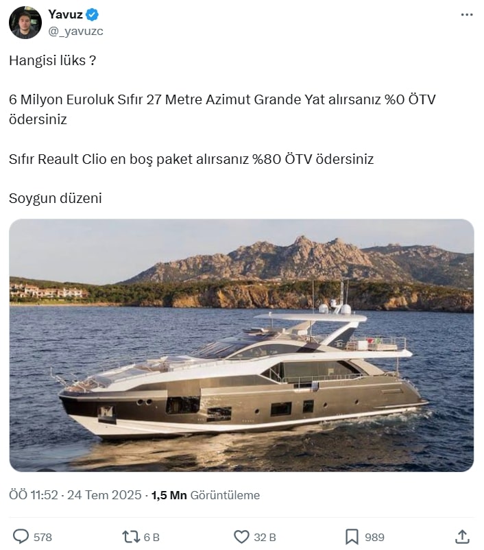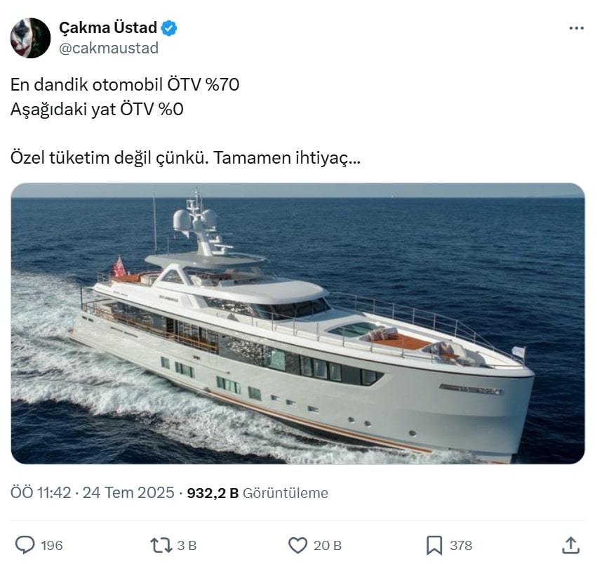 Bu yeni düzenleme sosyal medyada ses getirirken otomobilin özel tüketim vergisi ile yat arasında kıyaslama yapan paylaşımlar epey beğeni aldı. Bu paylaşımlarda ÖTV oranının otomobillerde %70 iken yat için %0 olduğu iddia edildi.