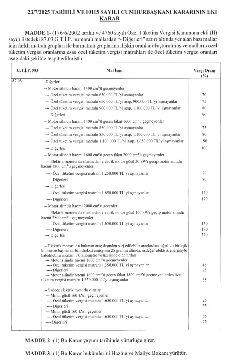 Otomobiller için ÖTV oranları ise çok daha farklı. 24 Temmuz 2025 tarihli ve aynı gün Resmî Gazete’de yayımlanan yeni düzenlemeye göre, binek otomobillerde ÖTV oranları %70 ile %220 arasında değişiyor.