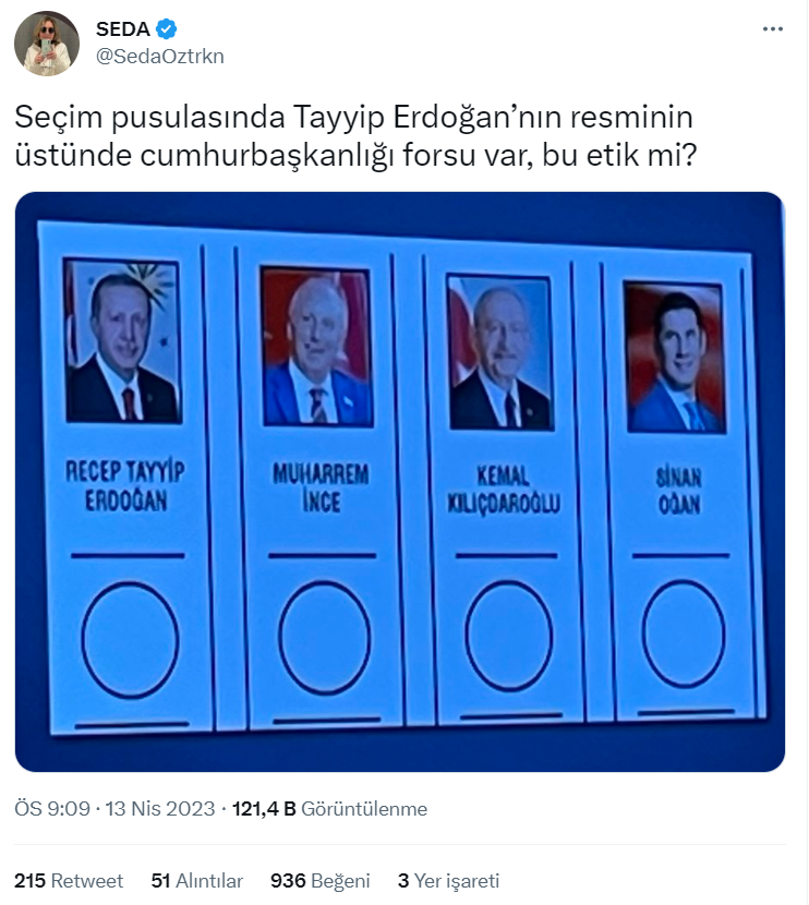 Bu paylaşımdan da anlaşıldığı üzere YSK heyeti tarafından onaylanan ve basımı gerçekleşen oy pusulalarında Recep Tayyip Erdoğan’ın fotoğrafının arka planı, tıpkı diğer Cumhurbaşkanı adayları gibi düz beyaz fondan oluşuyor.