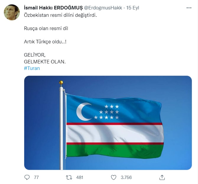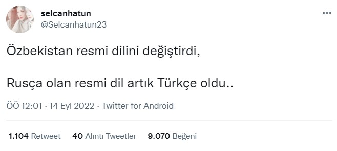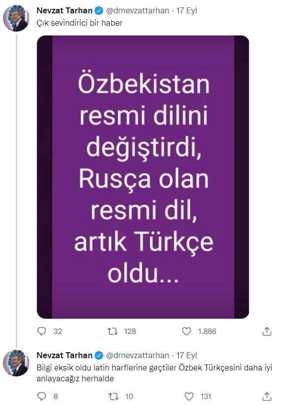 Sosyal medyada dolaşan bir iddiada, Orta Asya’da Türki Cumhuriyetlerden biri olan Özbekistan’ın resmi dilinin Rusça’dan Türkçeye çevrildiği dile getirildi. Bu bilgiyi Üsküdar Üniversitesi Kurucu Rektörü Nevzat Tarhan da resmi Twitter hesabında paylaşmış, daha sonra tweetine bir ekleme yaparak verdiği bilginin ‘eksik’ olduğunu belirtmişti.