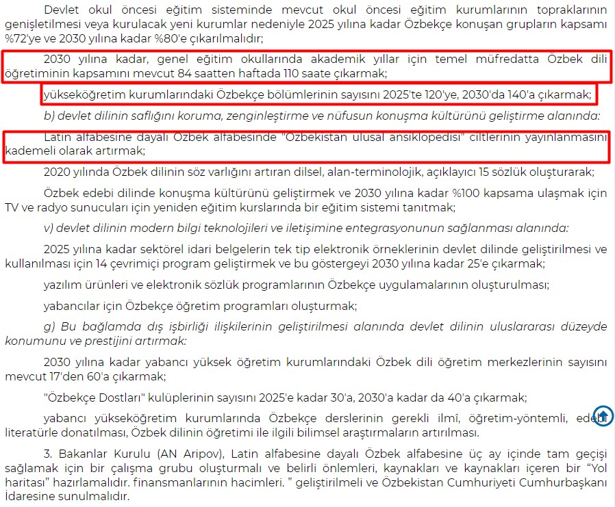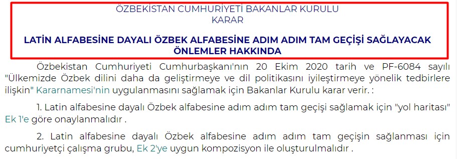 Özbek dilinin modern Latin alfabesiyle aktarımının adım adım gerçekleşeceği bir yol haritasını açıklayan kararname, 2023’ün başında tamamlanmış olacak. Esas amacının Özbekçe’yi Türki toplumlara tanıtmak ve yaygınlaştırmak olan bu çalışma kararnamesinde, Özbekçe derslerinin sayısının artması, daha önce Sovyetler döneminde kabul edilen ve yaygın olarak kullanılan Kiril alfabesi ile yazılan birçok kaynağın, Latin alfabesine çevrileceği gibi kökten değişimci birçok adımın atılacağı belirtilmiş.