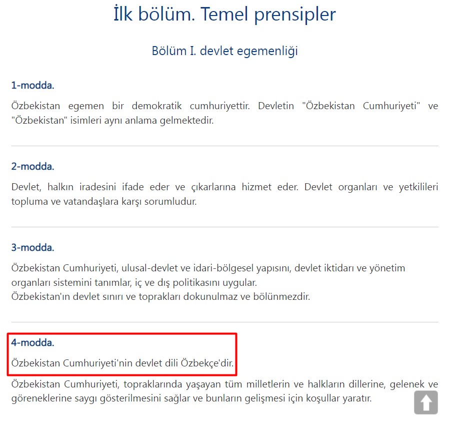 Özbekistan Anayasasına constituon.uz web adresi üzerinden ulaştığımızda, Özbekistan Cumhuriyeti Anayasası’nın 4. Maddesinde, Özbekistan Devletinin resmi dilinin “Özbekçe” olduğunu görüyoruz. Dolayısıyla bu da bize Özbekistan’ın resmi dilinin halihazırda ‘Rusça’ olmadığı sonucunu veriyor.