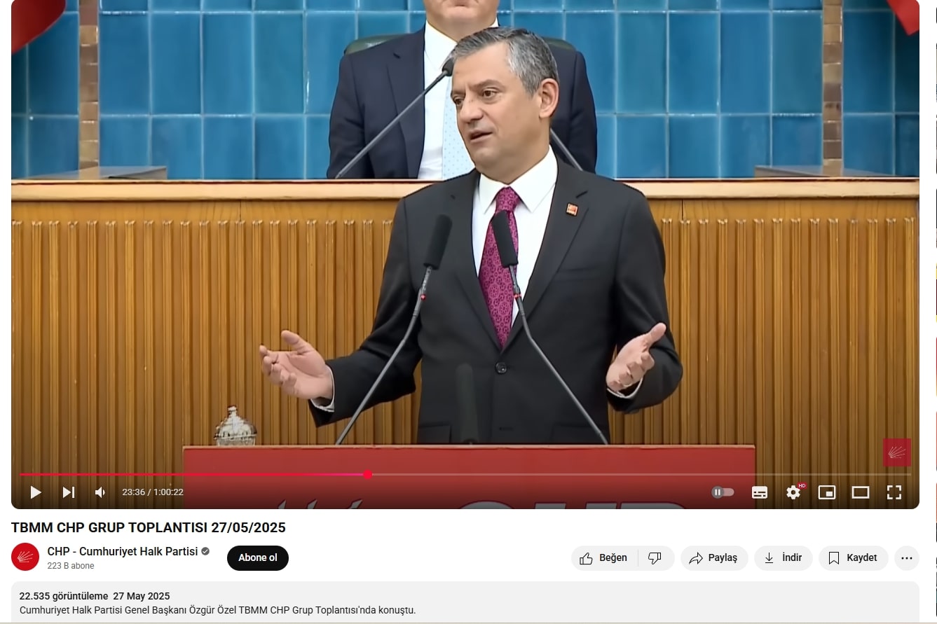 CHP Genel Başkanı’nın 27 Mayıs 2025’teki grup toplantısında yaptığı konuşmadan alınmış gibi görünüyor. Görüntülerde, Grup Başkanvekili Murat Emir’in kıyafeti aynı olmakla birlikte Özel’in siyah bir takım giydiği, kravatının da mor olduğu görülüyor.