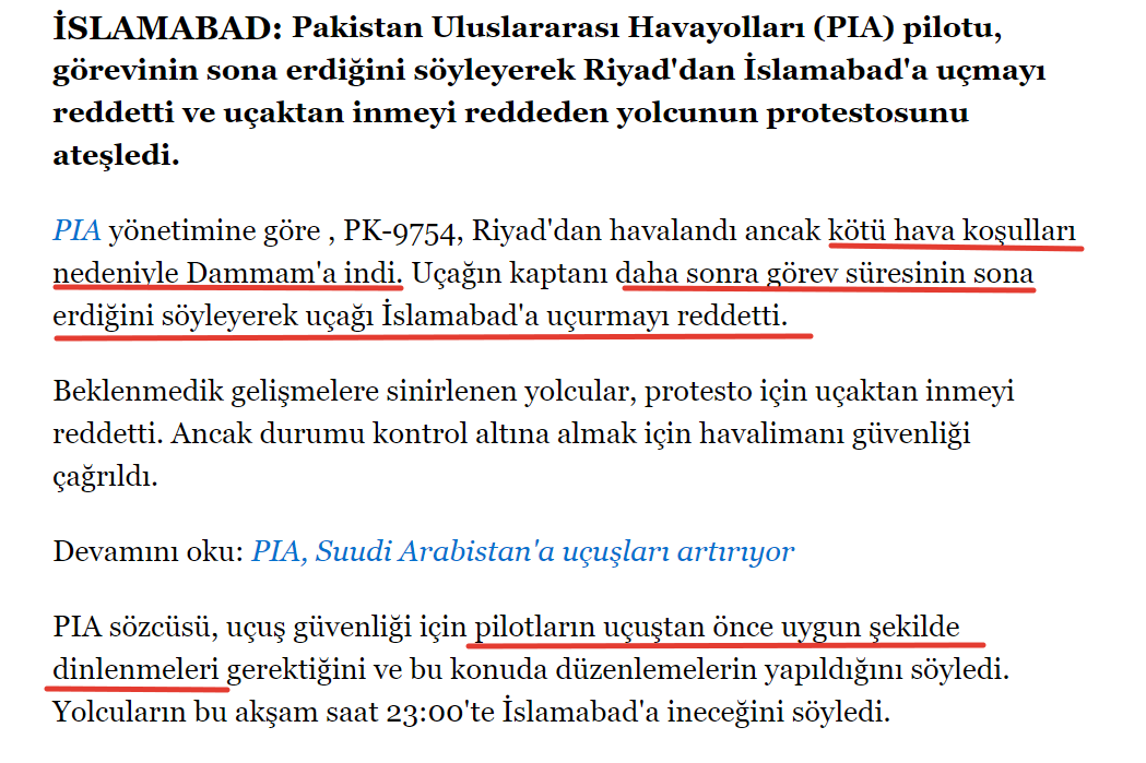PK-9754 seferli Riyad-İslamabad uçağı, Riyad’dan havalandı ve yarı yol diyebileceğimiz bir noktada inişe geçti. Ancak bunun sebebi, basında yansıtıldığı gibi mesai saati değil. PIA’nın açıklamasına göre kötü hava koşulları nedeniyle Suudi Arabistan’ın Damman kentine acil iniş yapıldı. Resmi açıklama da bunu destekler nitelikte.