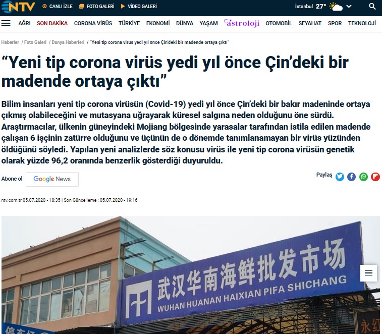 -Koronavirüs belirtileri görüldüğü iddia edilen Mojiang Madeni’nde enfekte olan işçilerden 2012 yılında alınmış örnekler yeniden incelendiğinde SARS-CoV-2 virüsüne rastlanılmadı.