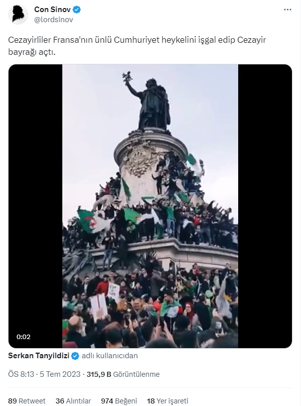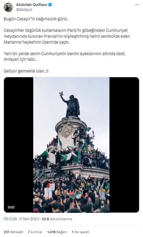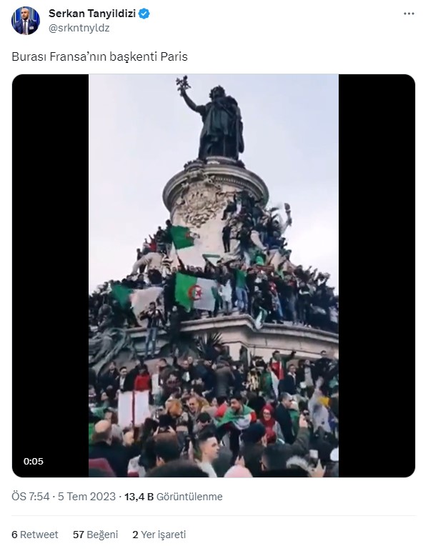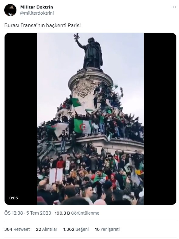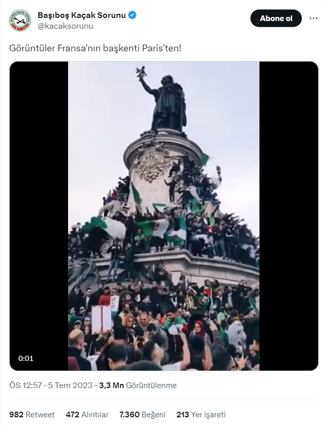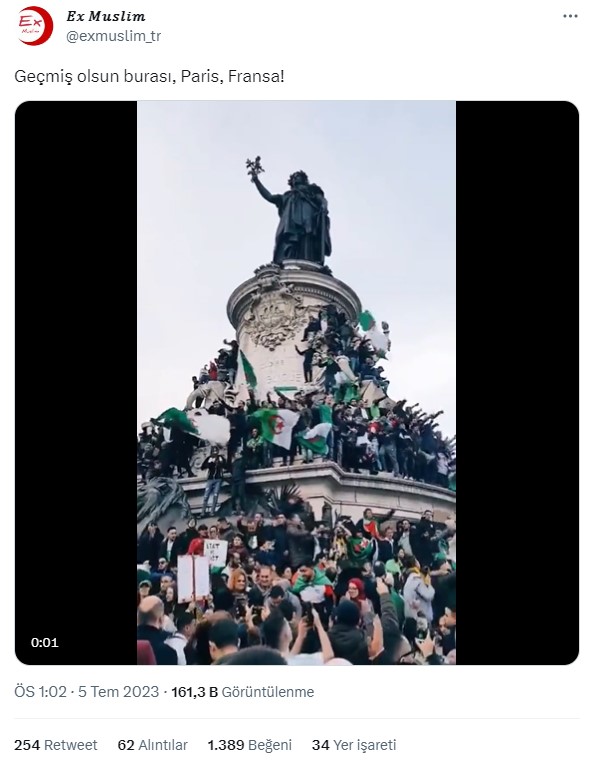 Fransa’da 17 yaşındaki Cezayir asıllı genç Nael’in ölümünün ardından başlayan protestolara dair görüntüler sosyal medyada yayılmaya devam ediyor. Dolaşıma giren son videolardan birinde Paris, Cumhuriyet Meydanı’ndaki Marianne heykelinin etrafında toplanıp Cezayir bayrağı açan kalabalığı gösteriyor.